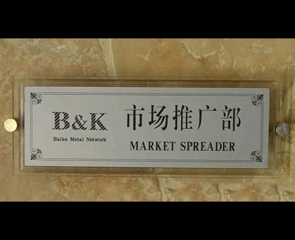 主要包括:1)门牌;2)门号牌;3)楼层牌;4)楼层分布牌;5)室内指向牌;6)室内空间功能说明牌;7)室内宣传告示牌;8)室内警示牌;9)疏散图与疏散引导牌;10)背景墙标识牌。从材料上区分,主要有:1)不锈钢板;2)铝板;3)镀锌钢板;4)压克力以及其他辅助材质。从结构上划分,主要有:1)个性化设计;2)普通铝合金型材;3)特殊铝合金型材等三种形式。相对来说,室内标识牌结构较为简单,用材和工艺比较讲究。